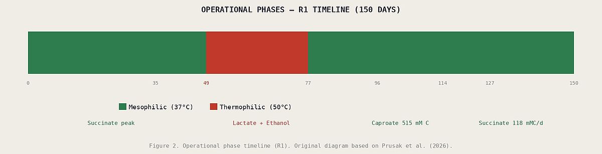 Caproate was strongly suppressed at 50°C while lactate and ethanol dominated. Original diagram based on Prusak et al. (2026).